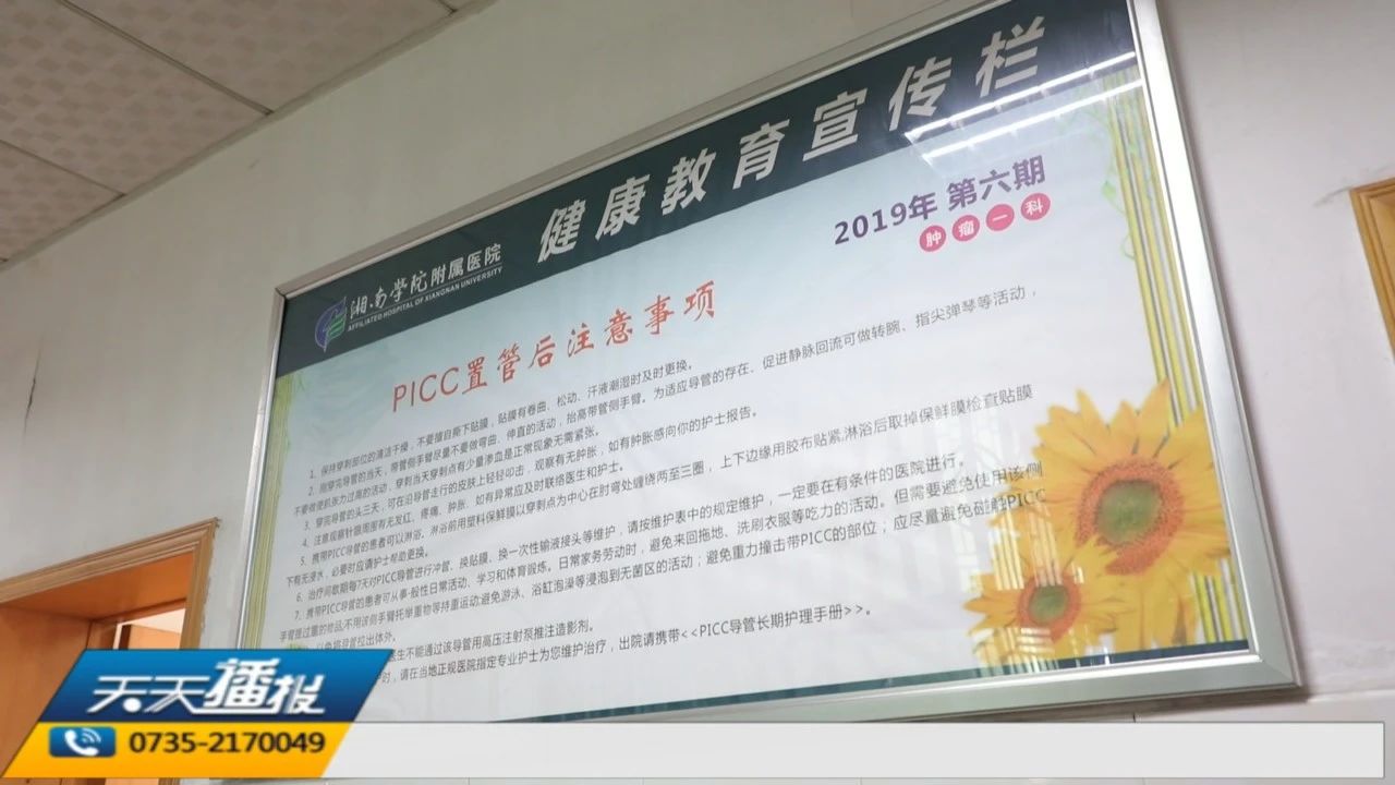 湘南学院附属医院肿瘤一科住院部里,大多是正在进行化疗的肿瘤患者。导管从外周手臂的静脉进行穿刺,直达靠近位于心脏上方的上腔静脉,棕红色的药物顺着导管流进体内,进行化疗。PICC置管,这种经外周静脉穿刺中心静脉置管术,打开了肿瘤患者的生命通道。
