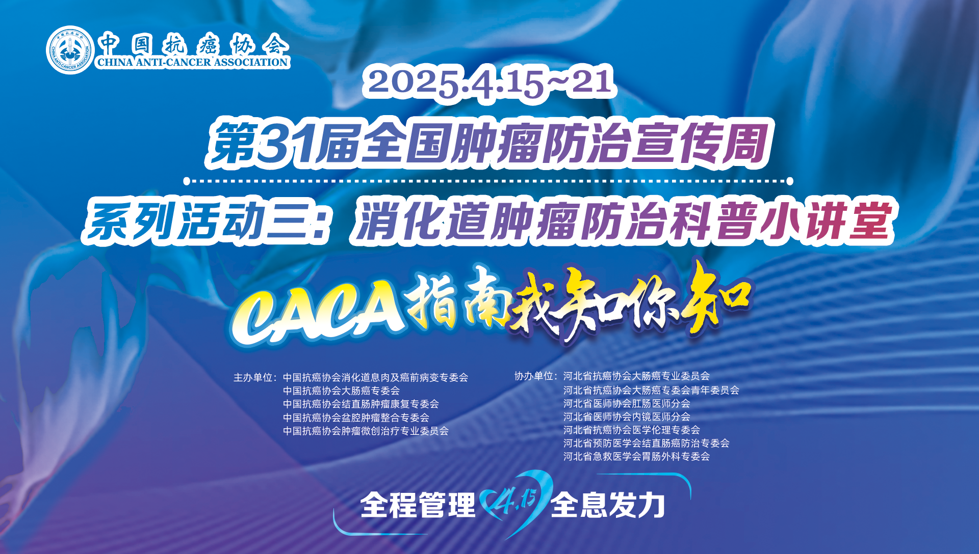 由中国抗癌协会发起的全国肿瘤防治宣传周(4.15-4.21),是我国历史最悠久、规模最大、影响力最强的防癌抗癌品牌科普活动,每年受到广大公众及患者的关注与响应。第 31届全国肿瘤防治宣传周活动将于 2025年4月 15日-21日在全国范围内开展。中国抗癌协会消化道息肉及前病变专委会致于提高消化道肿瘤的早期筛查和防治,将肿痼防治关口前移。降低恶性肿瘤发病率和死亡率。本次宜传周将进行专家科普宜讲会、专家科普“说”、消化道肿瘤防治科普小讲堂等系列活动,旨在提高全国人民对消化道肿瘤防治的水平。怕胃肠镜?专家教您科学应对!4月 16 日-21 日锁定直播间,权威解读消化道疾病防治要点,助您科学防癌。