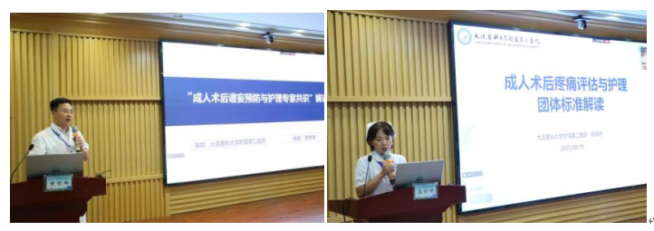 会议还特别设置了团体标准推广环节,为推动临床护理操作的规范化与标准化提供了重要学术支持。大医二院重症医学科李作坤教授对《成人术后谵妄预防与护理专家共识》进行了系统介绍,从评估工具到干预策略层层展开,为临床识别与处理术后谵妄提供了实用依据。大医二院消化道肿瘤二科高晓明教授就《成人手术后疼痛评估与护理》团体标准进行了深入解读,重点阐述了疼痛评估的标准化流程和护理措施的关键点,增强了护理人员在疼痛管理中的规范性和主动性。