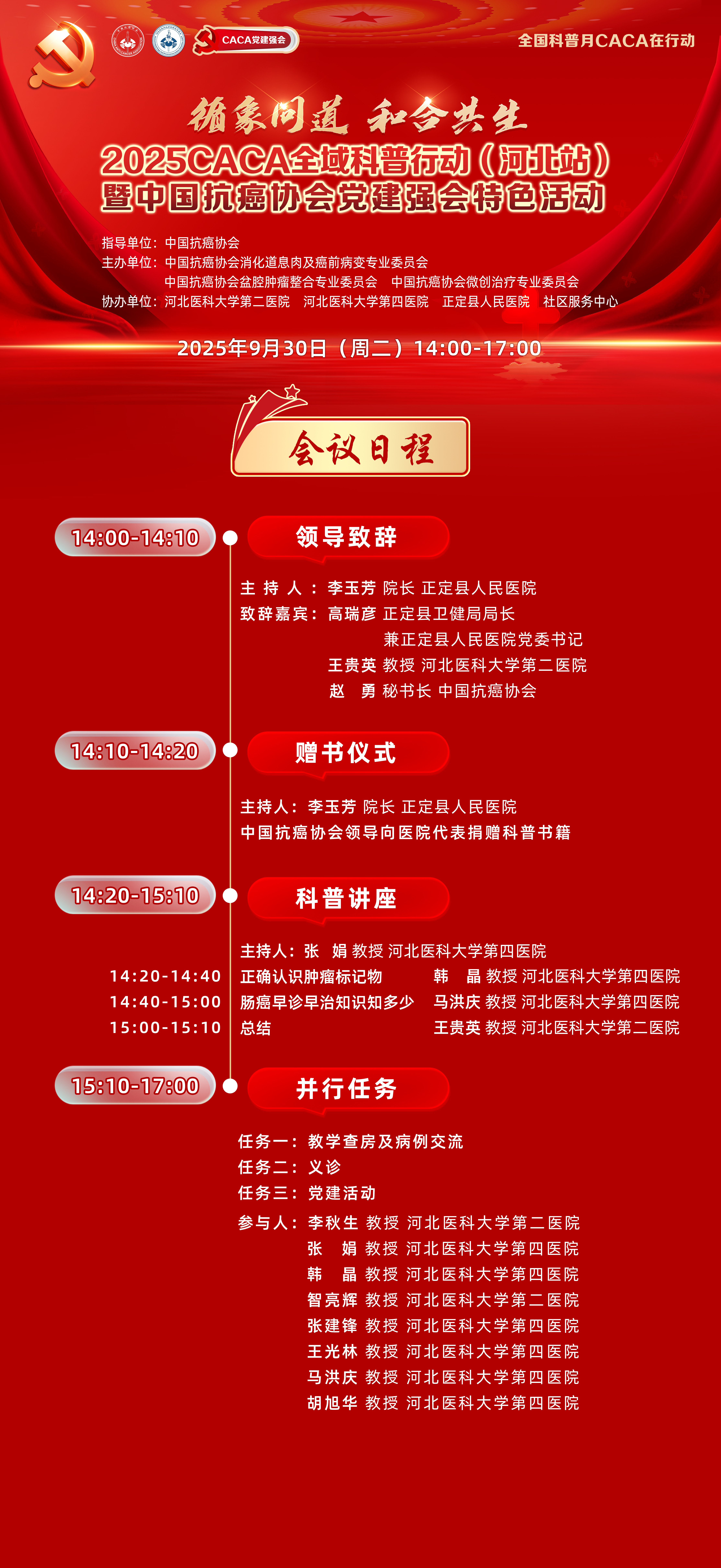 锚定“健康中国2030”战略航向,深植癌症防治“预防为主”核心根脉,“循象问道 和合共生”2025CACA全域科普行动(河北站)暨中国抗癌协会党建强会特色活动,即将于2025年9月29-30日在古城正定焕新启航,为消化道健康守护注入专业动能。