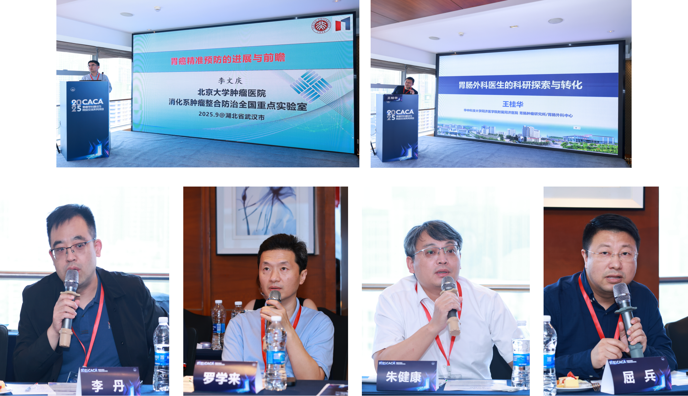 第一节学术会议北京大学肿瘤医院研究员李文庆教授以《胃癌精准防控的进展与前瞻》为题进行分享,华中科技大学同济医学院附属同济医院王桂华教授分享了《胃肠外科医生的科研探索与转化》。河南省人民医院李丹教授、华中科技大学同济医学院附属同济医院罗学来教授、山东第一医科大学第一附属医院朱健康教授、武汉大学人民医院屈兵教授参与两个话题的讨论交流。