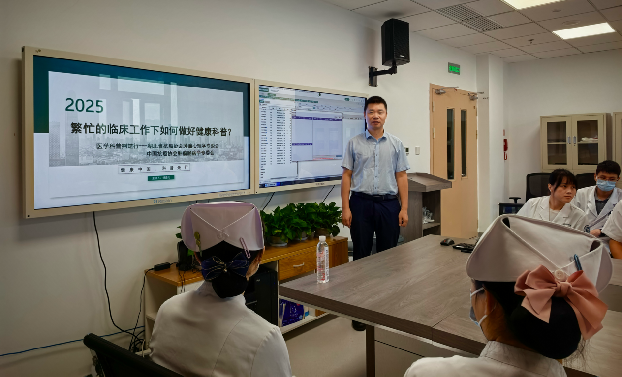 金秋送爽话健康,科普惠民暖人心。2025年9月18日,正值秋分节气前夕,湖北省抗癌协会肿瘤心理学专业委员会常委杨盛力副教授带领专家团队奔赴黄冈市中心医院,开展主题为“健康科普赋能基层医疗”的第十七期专题活动。在湖北省抗癌协会常务理事、黄冈市中心医院肿瘤中心邹佳华主任以及湖北省抗癌协会肿瘤心理专业委员会委员、黄冈市中心医院肿瘤中心主任助理朱晓东教授的全力支持与精心组织下,本次活动聚焦“繁忙的临床工作下如何做好健康科普”,为鄂东地区医务工作者带来兼具实用性与创新性的学术指导。