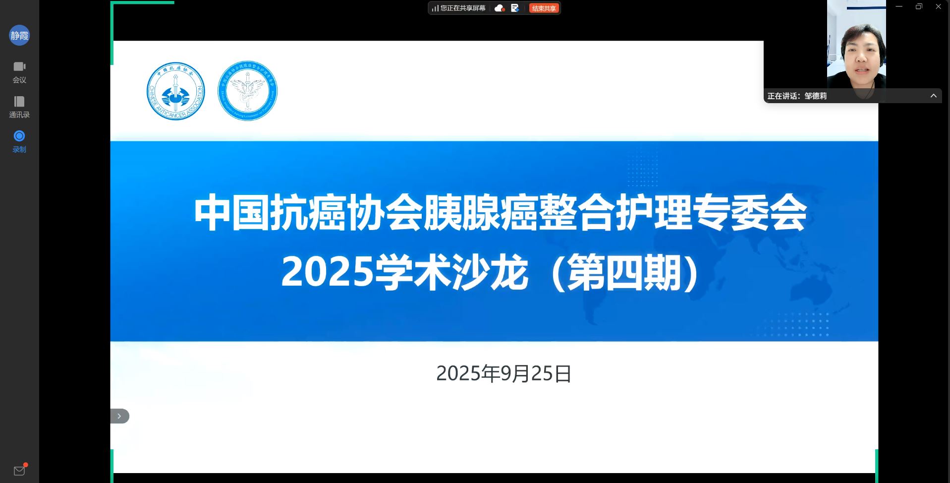 2025年9月25日,中国抗癌协会胰腺癌整合护理专委会2025学术沙龙第四期在成功线上举行。本次沙龙由中国抗癌协会胰腺癌整合护理专委会主办,海军军医大学第三附属医院/上海东方肝胆外科医院承办,汇聚了众多胰腺癌治疗领域的专家学者。