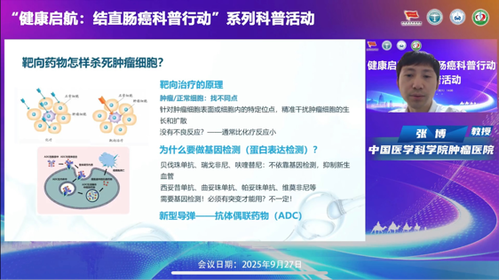 活动第六项由肿瘤内科张博教授以《结直肠癌药物治疗面面观》为主题,系统梳理免疫药物、靶向药物、化疗药物的应用逻辑。他通过通俗比喻,将不同药物的作用机制比作“精准导弹”“全面防护”,帮助网友理解;同时强调药物治疗需结合患者分期、基因检测结果制定个性化方案,详细说明各类药物的适用人群与常见副作用应对方法。直播中,他还提醒患者“切勿自行调整药量”,建议与主治医生保持密切沟通,确保治疗安全有效。