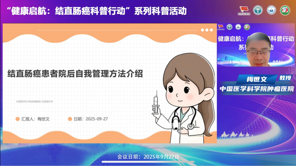 活动第九项结直肠外科梅世文医生聚焦《结直肠癌患者院后自我管理方法介绍》,从患者出院后的实际需求出发,构建“身体监测+生活调节+心理疏导”的全维度管理体系。直播中,他通过“管理清单”形式,明确院后需重点关注的指标:如定期记录排便情况、体重变化,出现腹痛、便血等异常症状时的应对流程;生活调节方面,他给出运动强度梯度建议,从术后初期的慢走,到恢复期的太极拳、瑜伽等,同时强调规律作息对免疫力维持的重要性。针对院后常见的焦虑情绪,他分享“情绪日记”“病友互助”等疏导方法,并提醒患者定期复诊的时间节点与注意事项,帮助患者建立“出院不代表治疗结束,科学管理是长期任务”的认知。