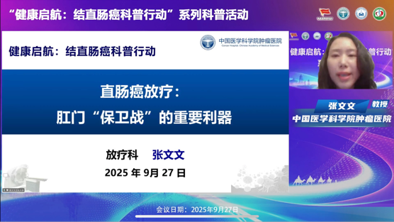 活动第七项由放疗科张文文教授以《直肠癌放疗:肛门‘保卫战’的重要利器》为主题展开讲解,首先点明放疗在直肠癌治疗中的核心价值,尤其是对肿瘤位置靠近肛门、希望保留肛门功能的患者,强调“科学放疗可缩小肿瘤体积,为保肛手术创造条件,或降低术后复发风险”。随后,她详细拆解放疗的适用场景,包括术前新辅助放疗、术后辅助放疗及晚期姑息性放疗的具体作用;针对网友担心的“放疗会损伤肠道”“放疗后副作用如何缓解”等问题,给出放疗期间肠道保护方法与副作用应对措施,如通过饮食调整减轻黏膜刺激、遵医嘱使用药物缓解腹泻等,让观众全面了解放疗的安全性与必要性,明白放疗不是“最后的选择”。