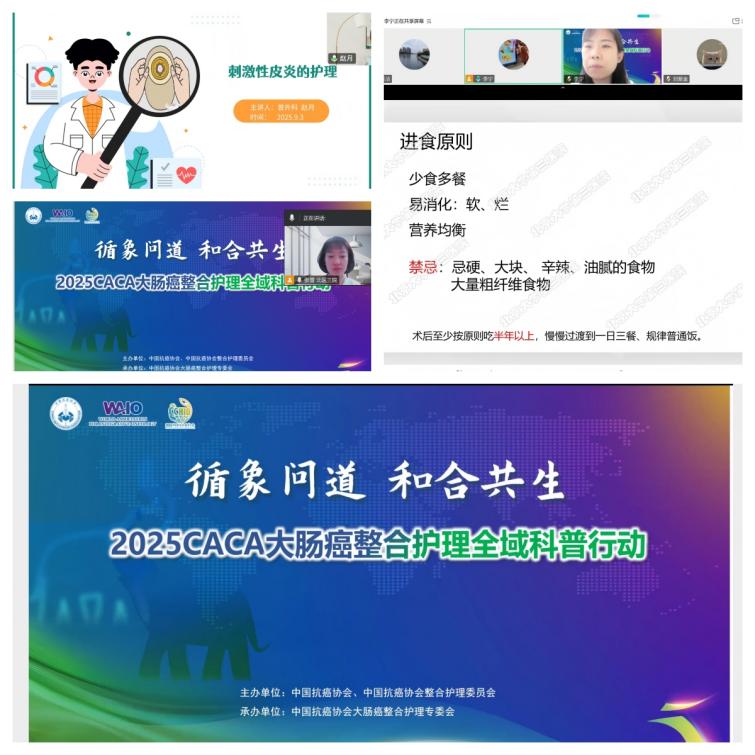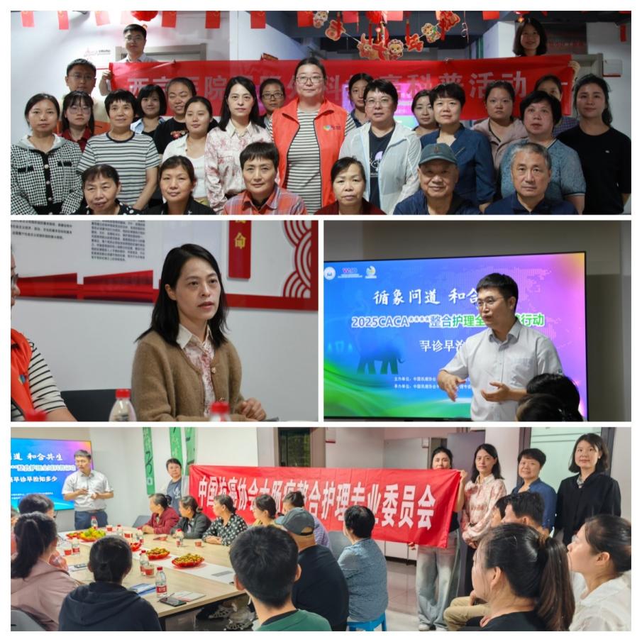为积极响应中国抗癌协会“循象问道 和合共生—2025CACA整合护理全域科普行动”的号召,提升全民科学素质,协力建设科技强国。聚焦整合医学“防筛诊治康”全程管理理念,系统传播CACA指南核心科普知识,中国抗癌协会大肠癌整合护理专委会的各位老师在全国多家医院开展相应科普活动,通过线上线下相结合的方式策划组织相关的科普活动,普及癌症预防、早筛、规范治疗及康复管理知识,增强全民健康意识,提升民众癌症防治核心知识知晓率。