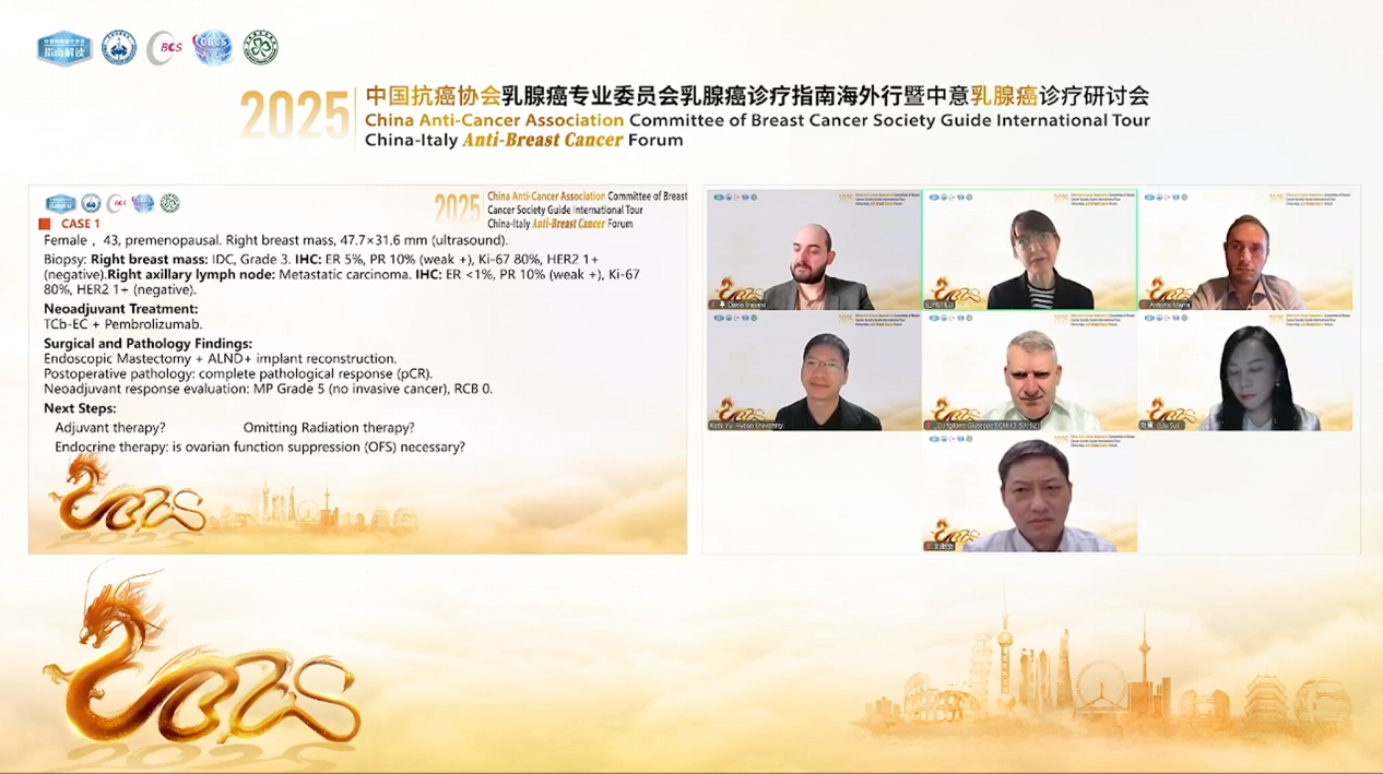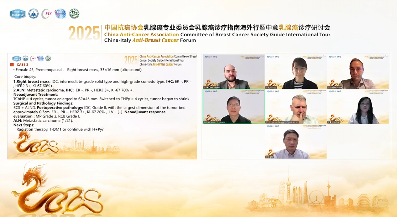 本次盛会不仅是中意乳腺癌学界的一次深度对话,更标志着中国诊疗指南正式迈向国际舞台。会议以ESMO与CACA双指南为经纬,贯穿从早期到晚期的精准策略,融汇外科创新与系统治疗进展,展现出“东方智慧”与“国际视野”的交相辉映。两例实战病例的思辨切磋,更将学术共识落于临床实处。期待以此次云端携手为契机,未来共同绘制更广阔的合作蓝图,推动全球乳腺癌诊疗迈向更高台阶,最终让更多患者获益。