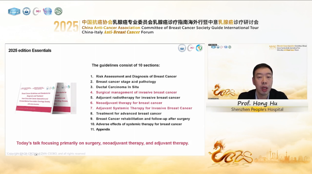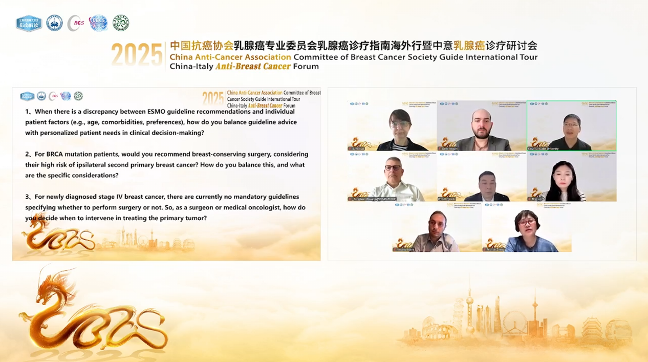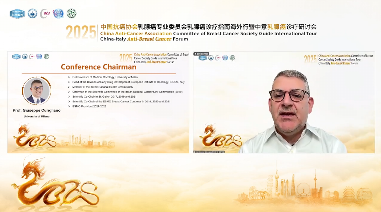 北京时间2025年10月26日15时30分,由中国抗癌协会乳腺癌专业委员会(CACA-CBCS)主办的 "2025中国抗癌协会乳腺癌专业委员会诊疗指南海外行暨中意乳腺癌诊疗研讨会"在云端隆重启幕。CBCS指南海外行将富有中国特色的创新实践推广至海外,为全球指南更新提供" 东方视角 "。时值2025ESMO大会刚刚落下帷幕,本次研讨会旨在推动CBCS指南的海外传播,深化中意两国在乳腺癌领域的学术交流与合作,共同提升诊疗水平。研讨会以ESMO与中国CACA两大权威指南前沿推荐为核心,聚焦早期与转移性乳腺癌治疗策略及外科新技术,中意顶尖专家云端对话,共探乳腺癌精准诊疗新进展。