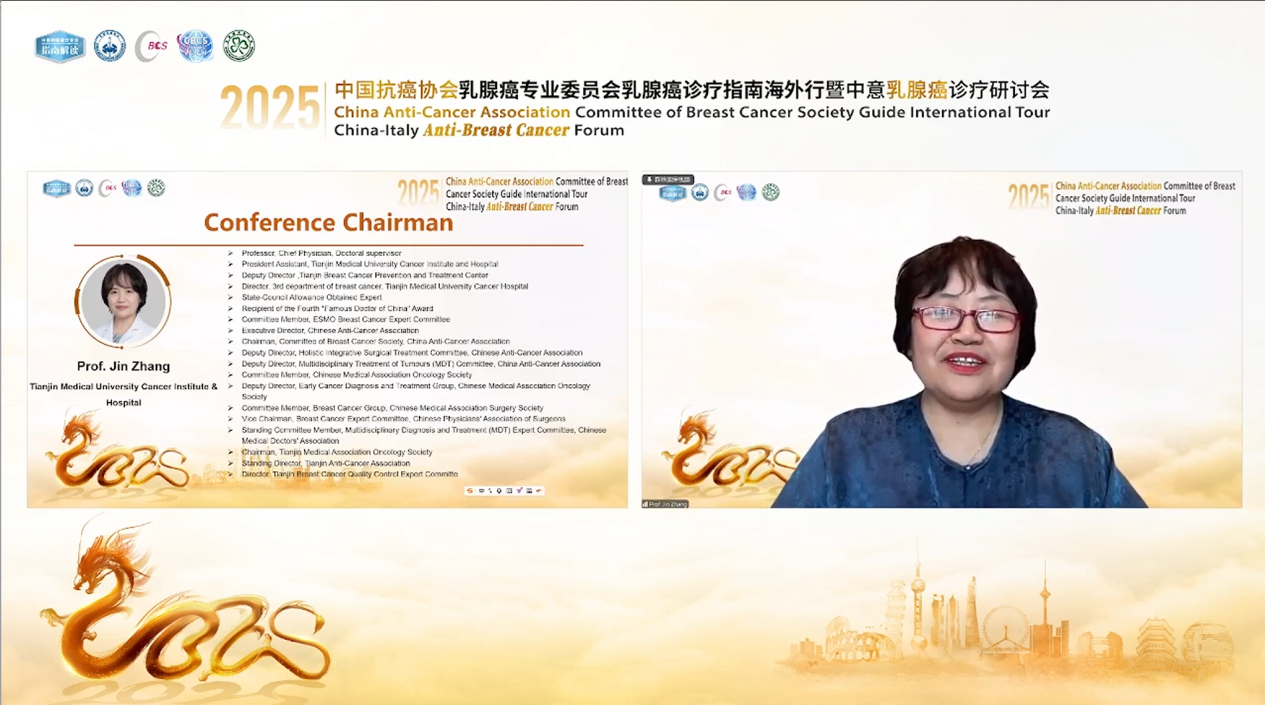 会议伊始,张瑾教授代表CACA-CBCS,向通过云端相聚,共同参与"乳腺癌诊疗指南海外行暨中意乳腺癌诊疗高峰研讨会"的各位专家同仁表示最热烈的欢迎。虽然相隔万里,但科技让大家得以跨越时空,为乳腺癌防治事业携手同行。中国抗癌协会乳腺癌专业委员会自1986年成立以来,汇聚近300名专家成员,持续推动学科发展。2007年发布《乳腺癌诊治指南与规范》,2025版已更新并推出英文版,多语种版本在译。委员会通过国际与基层巡讲,推动全球及中国县域诊疗均质化。期待与意大利专家深入交流,共促乳腺癌防治水平提升,预祝会议圆满成功!