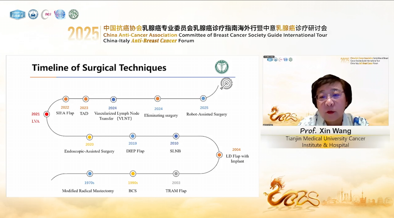 王欣教授系统分享了乳腺癌外科手术的最新进展,强调当前手术正朝着精准化、微创化与美容功能并重的方向发展。在腋窝手术管理方面,基于ACOSOG Z0011等研究证据,对于前哨淋巴结转移负荷较低的患者,避免不必要的腋窝淋巴结清扫已成为标准实践,显著降低了上肢淋巴水肿风险。针对新辅助治疗后腋窝淋巴结转阴的患者,靶向腋窝手术(如标记淋巴结活检)正逐步替代传统清扫,实现精准降级。在淋巴水肿防治领域,预防性手术技术,如即时淋巴重建(ILR),在清扫术中同期进行淋巴管-静脉吻合,有效导流淋巴液,从源头预防水肿发生。此外,超显微淋巴吻合技术(LVA)与血管化淋巴结移植(VLNT)也为治疗已发生的水肿提供了有效手段。在乳房手术方面,肿瘤整形保乳术(OPS)、内镜辅助与机器人辅助手术日益成熟。王教授展示了通过腋窝单孔入路完成的机器人保乳及重建手术的案例,实现了肿瘤根治、微创与美容的完美结合,患者满意度高。