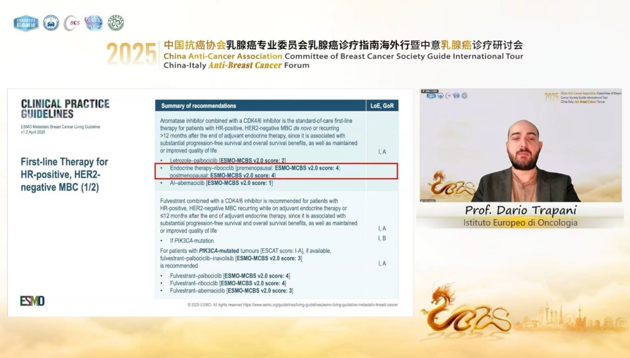 Dario Trapani教授聚焦转移性乳腺癌(MBC)诊疗进展,系统阐述了2025版ESMO指南(以下简称“指南”)的核心更新与临床实践要点。对于新发或复发MBC患者,转移灶活检是确认组织学与再评估生物标志物的基石。指南推荐进行全面基因组分析,依据ESCAT分级指导靶向治疗,并鼓励基于分子特征入组临床试验。对于HR+/HER2- MBC,一线治疗首选芳香化酶抑制剂(AI)联合CDK4/6抑制剂,其中瑞波西利因其生存和生活质量获益的双重价值获得ESMO-MCBS v2.0同类最高评分(4分);内分泌耐药者,需检测PIK3CA、ESR1等突变以指导后续靶向治疗;gBRCA突变患者,PARP抑制剂是重要选择。对于HER2阳性 MBC,一线标准治疗为曲帕双靶联合化疗;二线优先推荐T-DXd,对脑转移患者需综合局部治疗与高效系统药物联合治疗。对于三阴性乳腺癌 MBC,PD-L1阳性者首选化疗联合免疫检查点抑制剂;gBRCA突变者推荐PARP抑制剂;后线治疗中,戈沙妥珠单抗与T-DXd显示出显著获益优势。对于寡转移患者,建议多学科评估进行局部根治性治疗;对骨转移,需规范使用骨改良剂并防范相关事件;脑及脑膜转移应参照神经肿瘤指南管理。