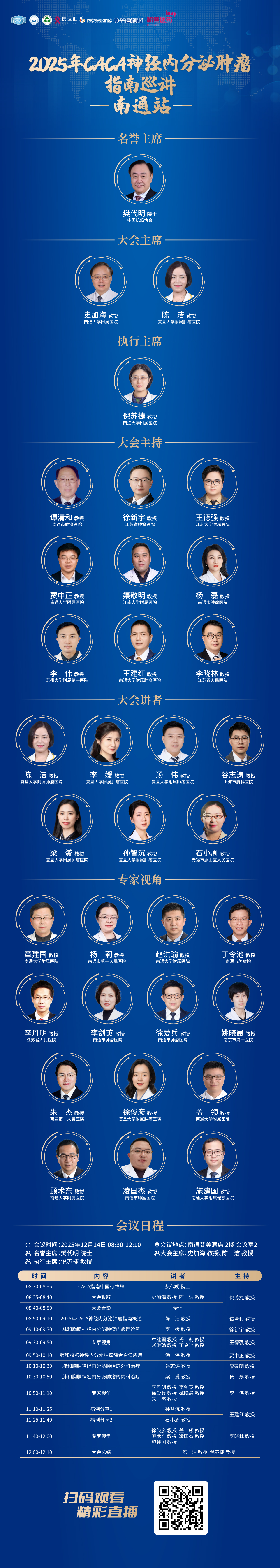 2025年12月14日,CACA神经内分泌肿瘤指南巡讲(南通站)即将开启。此次活动是中国抗癌协会神经内分泌肿瘤专委会精心策划、重点部署的诊治指南解读系列活动的重要一站。活动邀请到中国抗癌协会理事长樊代明院士致辞,复旦大学附属肿瘤医院陈洁教授、南通大学附属医院史加海教授担任大会主席,携手国内神经内分泌肿瘤领域多位知名专家,共同探讨神经内分泌肿瘤的综合诊治策略和前沿技术。