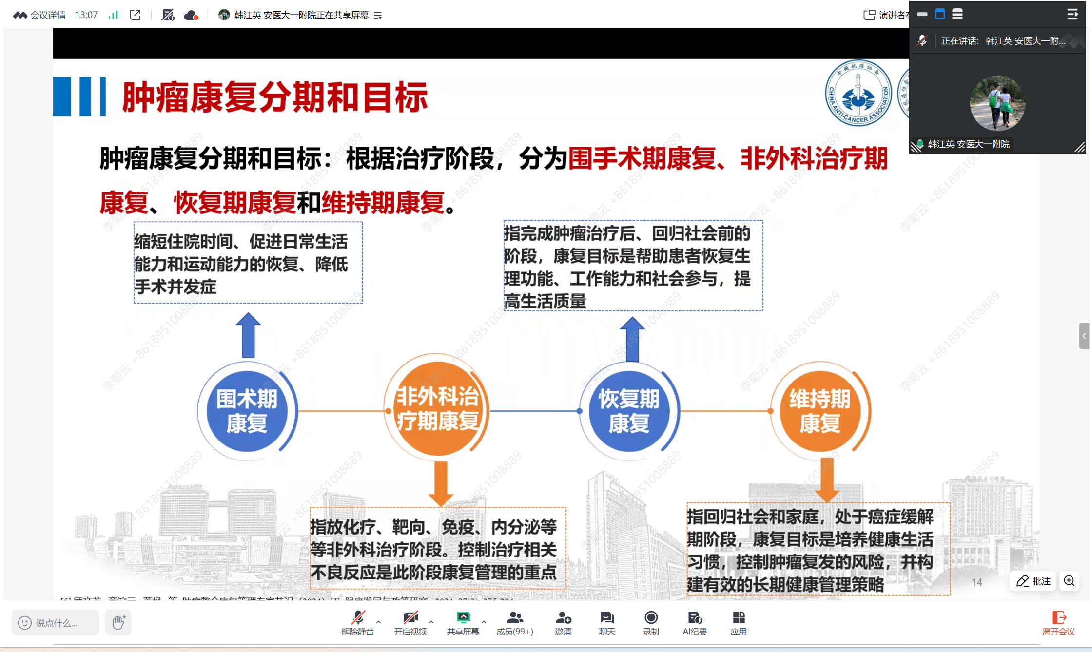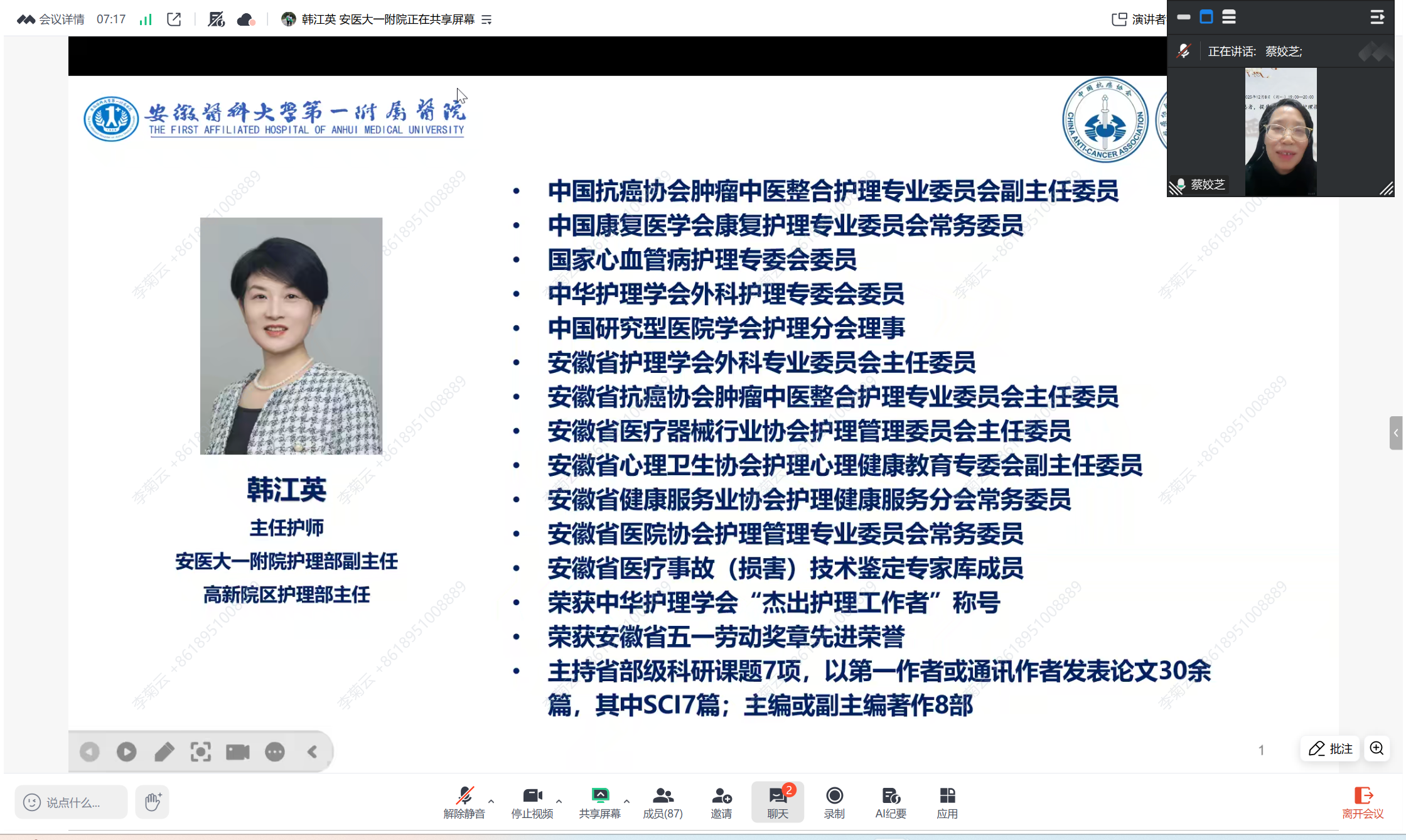 专委会副主任委员、安徽医科大学第一附属医院护理部韩江英副主任以《肿瘤康复中西医协同探索与优化策略》为题,分享了整合护理的前沿实践。她指出,肿瘤康复需打破学科壁垒,将中医“整体调理”与西医“精准干预”有机融合,通过建立中西医协同评估体系,能精准调整康复方案,缩短患者康复周期。韩主任强调:“协同不是简单叠加,而是优势互补——让患者在康复中既享受到西医的高效,又感受到中医的温和,提升整体体验。”