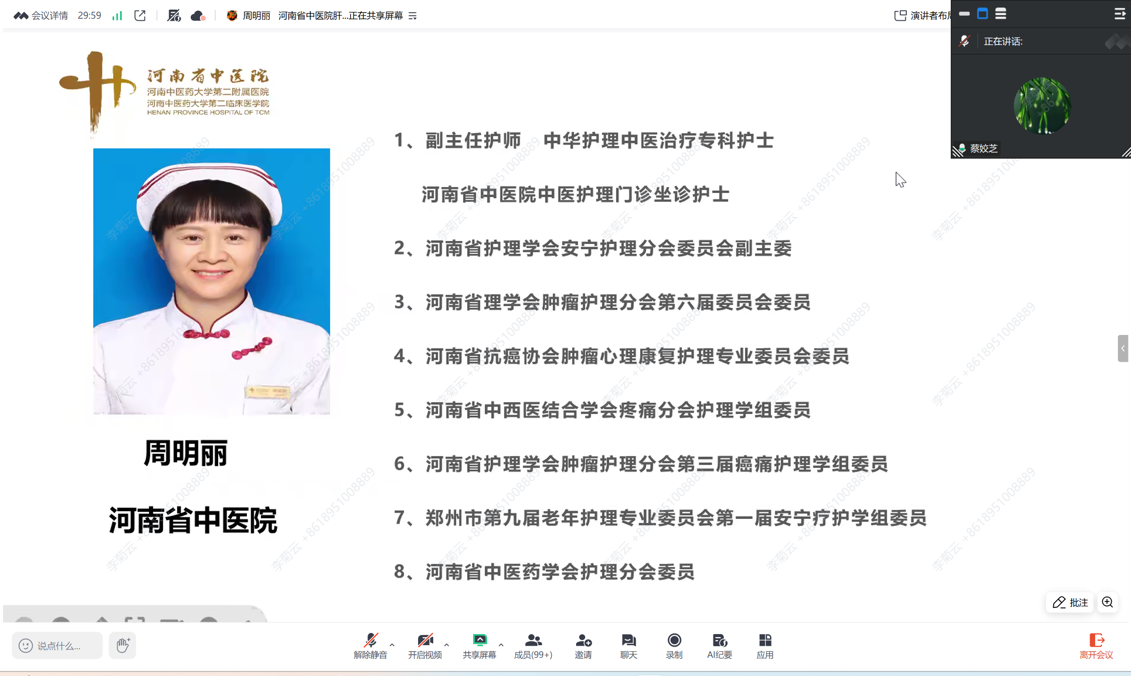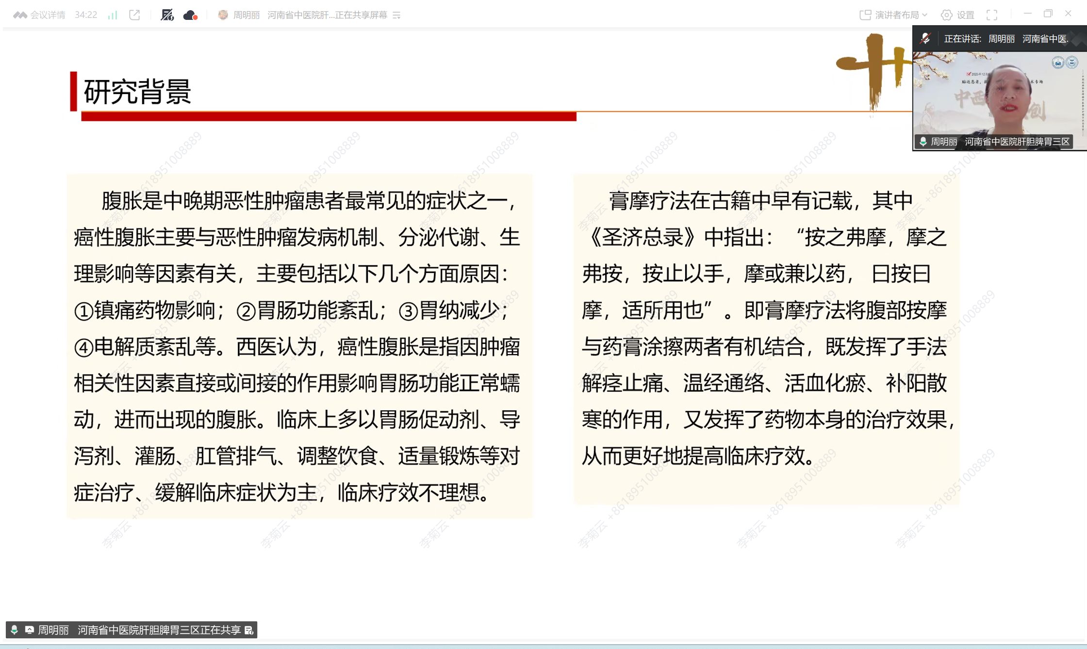 河南省中医院肝胆脾胃三区周明丽护士长带来《“摩与药俱,向火摩之”技术改善癌因性腹胀》的专题分享。癌因性腹胀是晚期肿瘤患者的高发症状,发生率较高,严重影响进食与睡眠。周护士长介绍的这项中医特色技术,以温热中药膏剂敷于腹部,配合穴位按摩(“摩”),通过温通经络、理气消胀,促进肠道蠕动。
