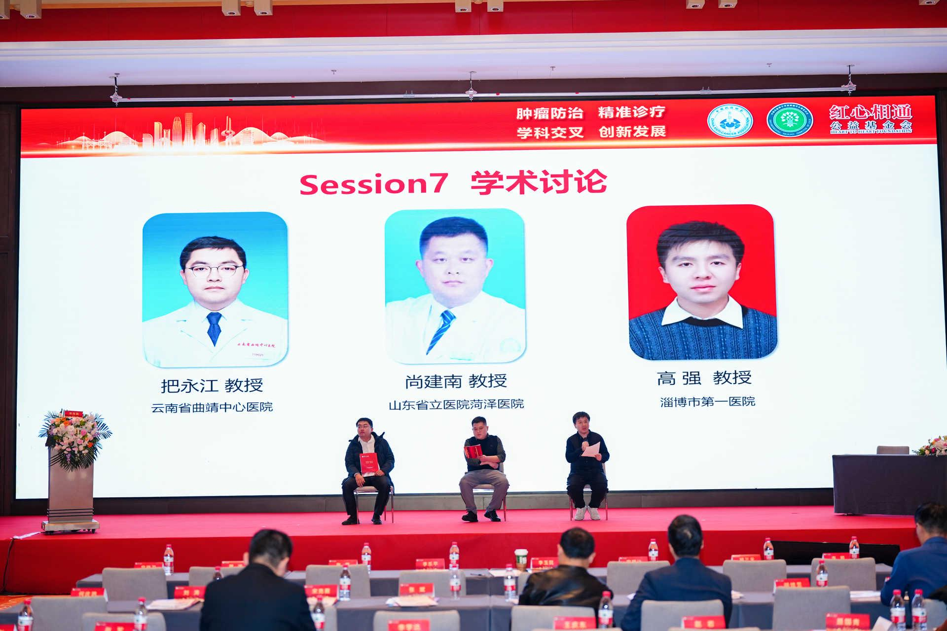 第二部分学术报告由常州市肿瘤医院于静萍教授、兰州大学第二医院毛杰教授、青岛大学附属医院胡维昱教授主持。浙江省肿瘤医院陈天辉教授分享了《石棉暴露与肺癌》的研究成果。华中科技大学协和医院吴川清教授探讨了《环境肿瘤学与胃肠外科》,他阐述了环境因素在胃癌、结直肠癌发生中的作用,并讨论了在胃肠肿瘤外科决策中,如何综合考虑环境风险背景、肿瘤分子特征与患者全身状况,实现更精准的个体化治疗。山东大学齐鲁医院胡三元教授以《外科技术的创新与发展》为题,精彩展示了微创外科技术的最新飞跃。随后,潍坊市人民医院马永彪教授、聊城市人民医院刘桂杰教授、山东省公共卫生中心郭帅教授,分别围绕《抗血管生成疗法在晚期胆道癌全程管理中的临床获益与优势》、《HCC伴大血管侵犯诊疗前沿》、《抗血管生成疗法在ES-SCLC全程管理中的策略思考》作了专题报告。这些报告从不同癌种角度,深入分析了靶向药物在改善晚期患者生存预后、优化治疗序列中的重要作用,为临床诊治提供了重要参考。