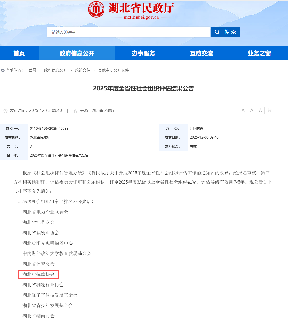 初冬时节,捷报传喜。湖北省抗癌协会在湖北省民政厅社会组织等级评估中斩获 5A 最高等级,恰逢协会成立 40 周年,这份沉甸甸的荣誉既是对协会多年深耕防癌抗癌事业的权威认可,更是为四十年华诞献上的最珍贵贺礼。从 1985 年张明和教授等先驱筹备创建至今,协会始终坚守 "团结抗癌、科技惠民" 初心,在荆楚大地上书写了一段学术与公益共生的动人篇章。