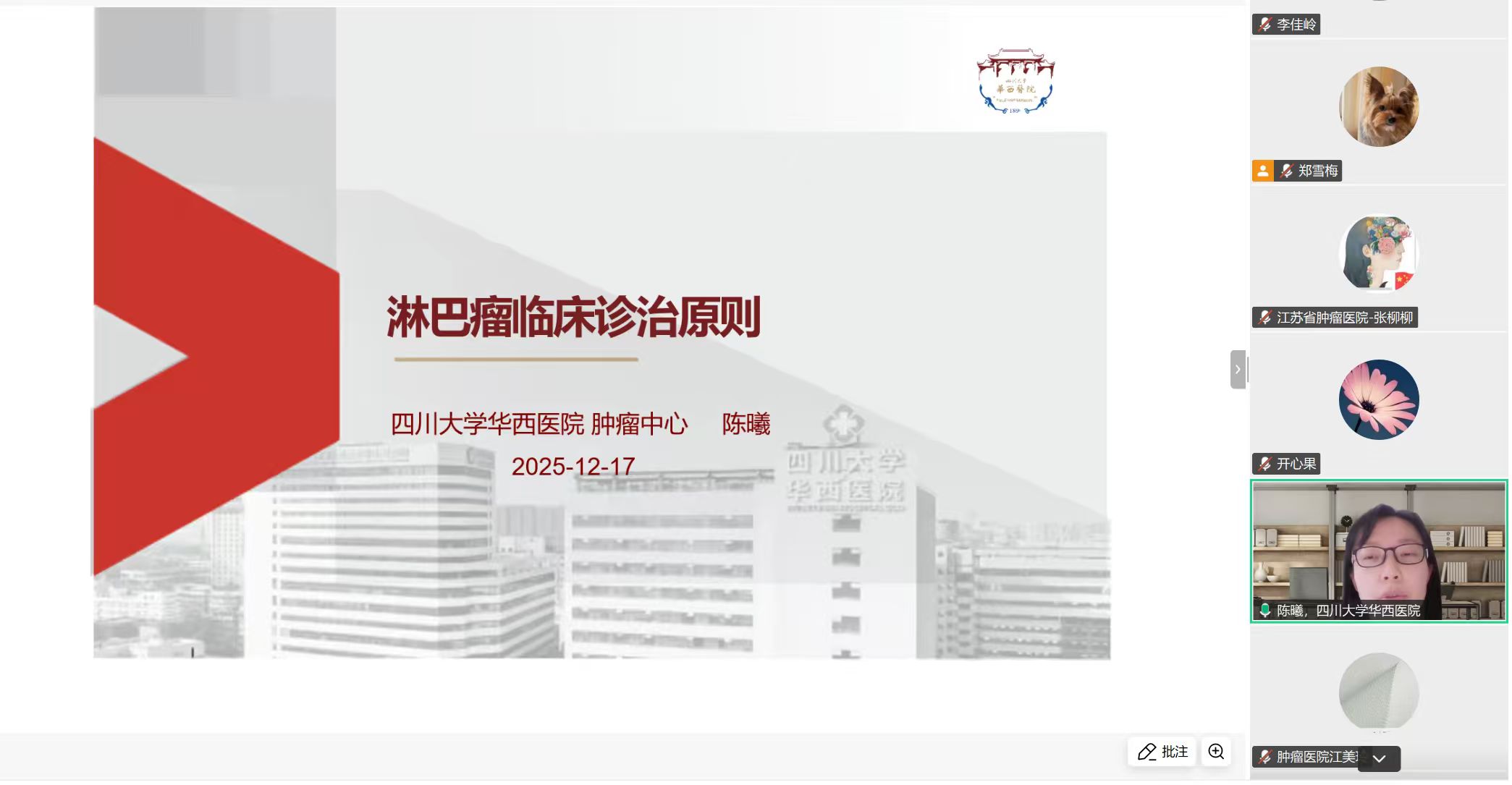 2025年12月17日下午,由中国抗癌协会淋巴瘤整合护理专业委员会主办、四川大学华西医院头颈肿瘤病房承办的“2025年中国抗癌协会淋巴瘤整合护理专业委员会学术会议”于线上成功召开。本次会议以“立足临床 循证融通”为主题,汇聚全国淋巴瘤诊疗与护理领域的专家学者及临床骨干,围绕淋巴瘤临床规范化实践、精准护理发展等核心议题展开深入交流。