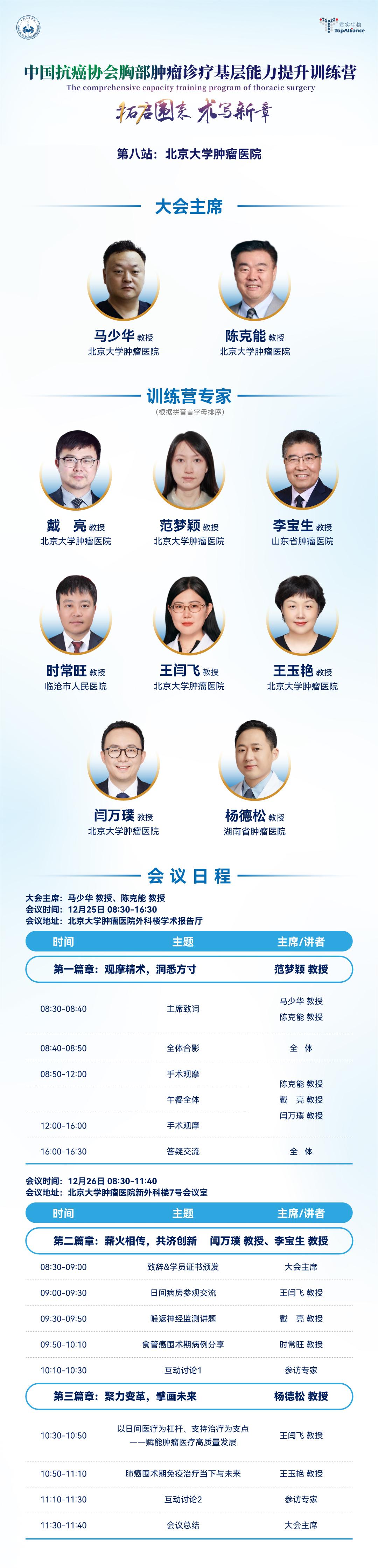 继前七站活动圆满落幕后,12月25日至26日,本年度训练营的第八站将走进北京大学肿瘤医院。本次训练营由北京大学肿瘤医院马少华教授与陈克能教授共同领衔,汇聚了国内胸外科领域的数十位权威专家。活动特别设置了丰富的实战教学环节,沉浸式观摩高难度的胸外科手术操作,感受精微手术技术的魅力,通过真实的疑难病例分享与互动讨论,展开多维度、深层次的学术碰撞,提升基层医生对复杂病情的综合判断能力。
