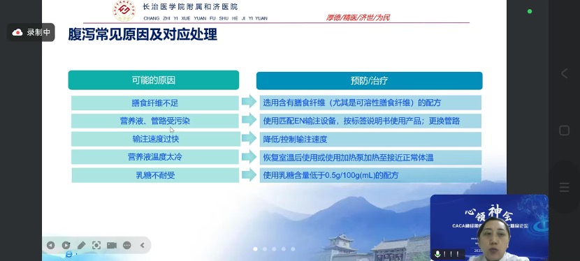 长治医学院附属和济医院神经外科李红霞护士长做《神经外科重症患者肠内营养期间腹胀腹泻的监测及护理》汇报