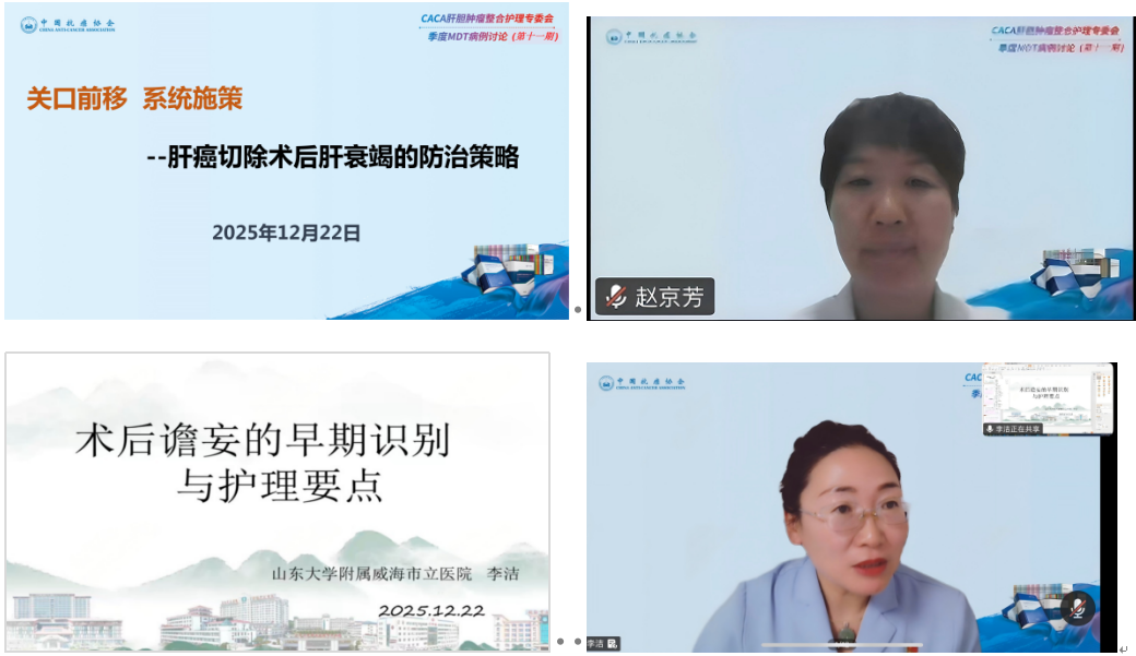 2025年12月22日由中国抗癌协会胆肿瘤整合护理专委会主办,四川大学华西医院、山东大学附属威海市立医院、山东第一医科大学附属山东省立医院、空军军医大学西京医院四家单位联合承办的“第十一期季度MDT病例讨论会”通过腾讯会议平台顺利召开。本次会议以“研精‘胆’思,‘肝’之如怡”为主题,吸引了100余名全国肝胆肿瘤护理领域专家学者及临床工作者在线参与,共同探讨肝胆肿瘤护理前沿进展与多学科协作(MDT)实践经验。会议由专委会宋汉歌副主任委员主持。