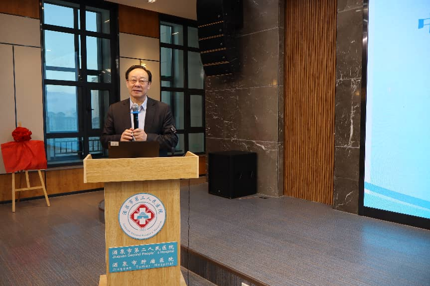 茹爱忠书记介绍了酒泉市第二人民医院的发展概况,包括人员队伍、医疗设备配置及年诊疗量等核心情况,并客观分析了医院在肿瘤防治领域存在的短板。他表示,医院后续将加快环境肿瘤防治基地实体化建设,强化人才培养与技术引进,积极开展临床与科研工作,全力打造区域基层肿瘤防治标杆单位。