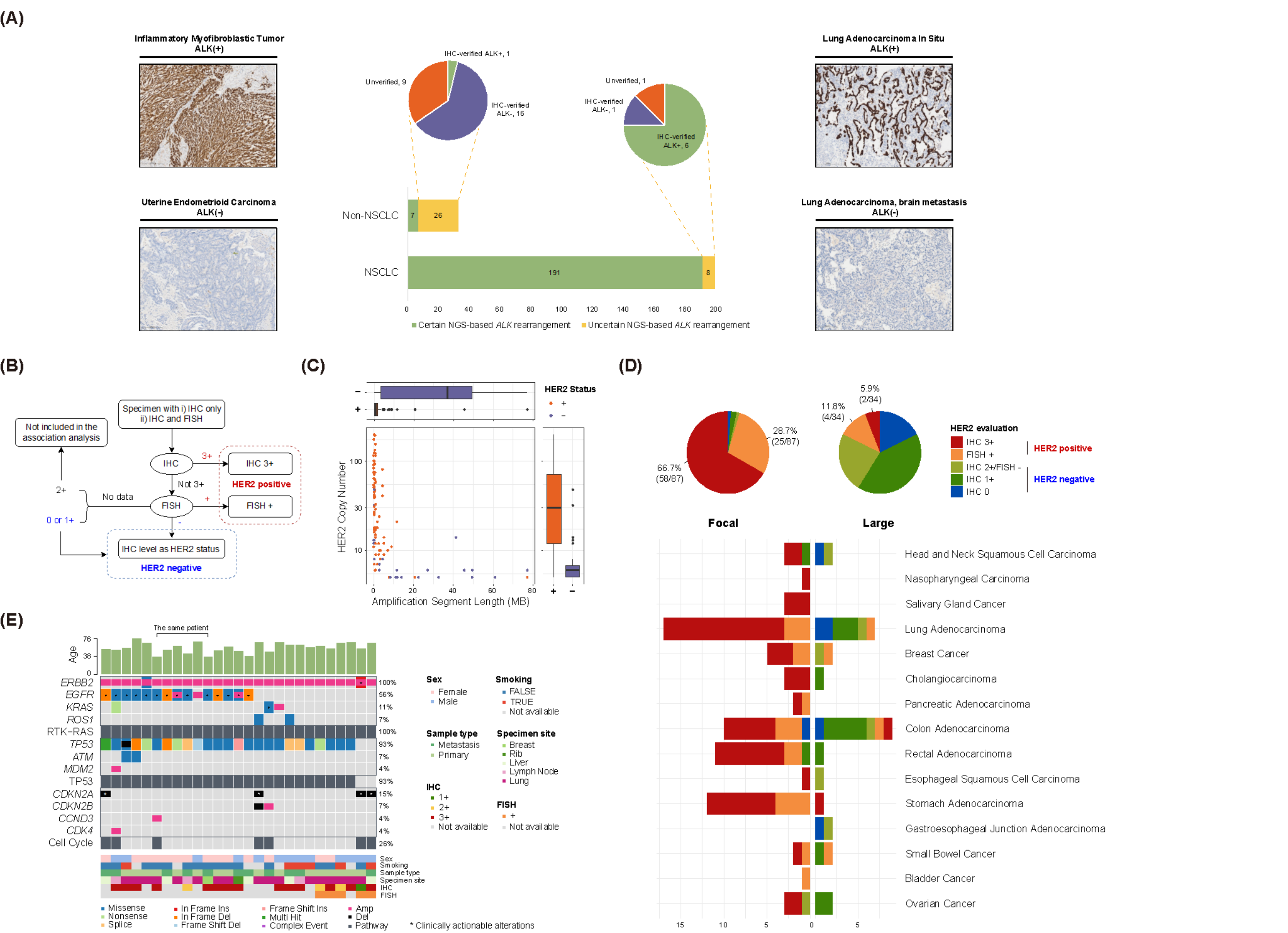 研究还验证了NGS与传统分子病理检测技术方法(IHC/FISH)的一致性,发现NGS检测ERBB2局灶性扩增与HER2阳性状态(IHC 3+或FISH+)之间存在密切关联。在肺腺癌中,ERBB2局灶性扩增患者(1.4%)通常伴随高频率TP53突变(93%),部分患者在EGFR靶向治疗耐药后接受HER2抗体偶联药物(ADC)治疗获得疾病控制,提示HER2靶向方案可为该类肺腺癌患者带来明确临床获益。此外,非小细胞肺癌中NGS检测ALK重排与免疫组化验证结果高度一致,为优化多平台联合检测策略提供了实证依据。