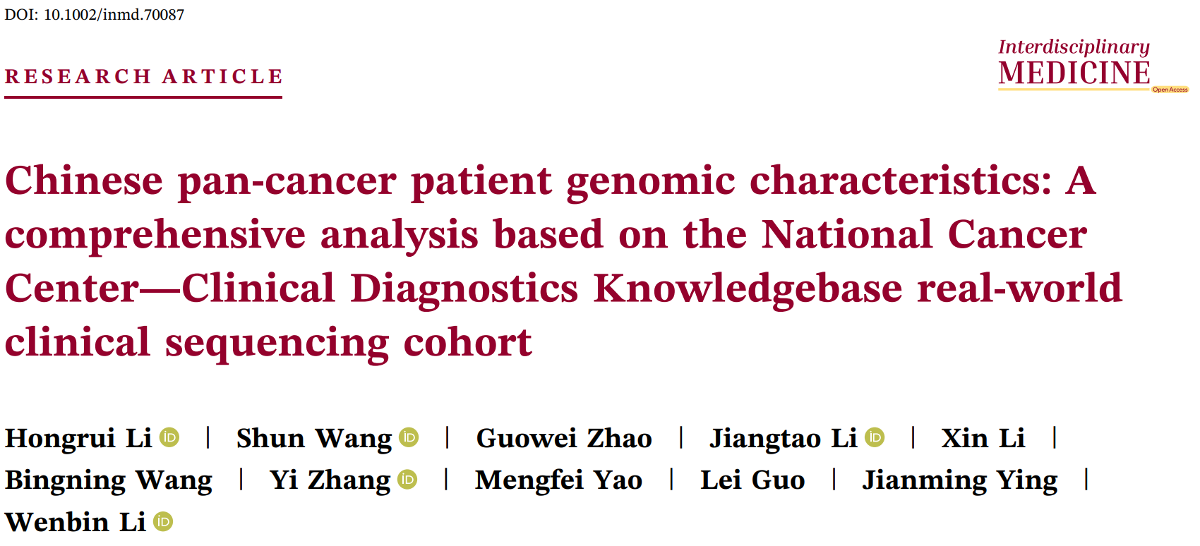 2026年1月16日,中国医学科学院肿瘤医院李文斌、应建明教授团队在国际期刊Interdisciplinary Medicine在线发表题为“Chinese pan‐cancer patient genomic characteristics: A comprehensive analysis based on the National Cancer Center—Clinical Diagnostics Knowledgebase real‐world clinical sequencing cohort”的研究论文。该研究构建国内首个大规模泛癌真实世界基因组数据库NCC-CLINDx,汇集2018年1月至2024年6月期间在中国医学科学院肿瘤医院接受NGS基因检测的6858例患者的6935对肿瘤-正常配对样本,覆盖54种常见肿瘤类型、270余种亚型,以非小细胞肺癌(34.4%)、结直肠癌(25.0%)、胃腺癌(5.3%)等临床高发肿瘤为主,队列特征在一定程度上反映了中国临床肿瘤患者的真实分布情况。研究采用涵盖520个肿瘤相关基因的靶向测序panel,通过严格质量控制和标准化分析流程,确保数据可靠性和基因变异检测准确性。