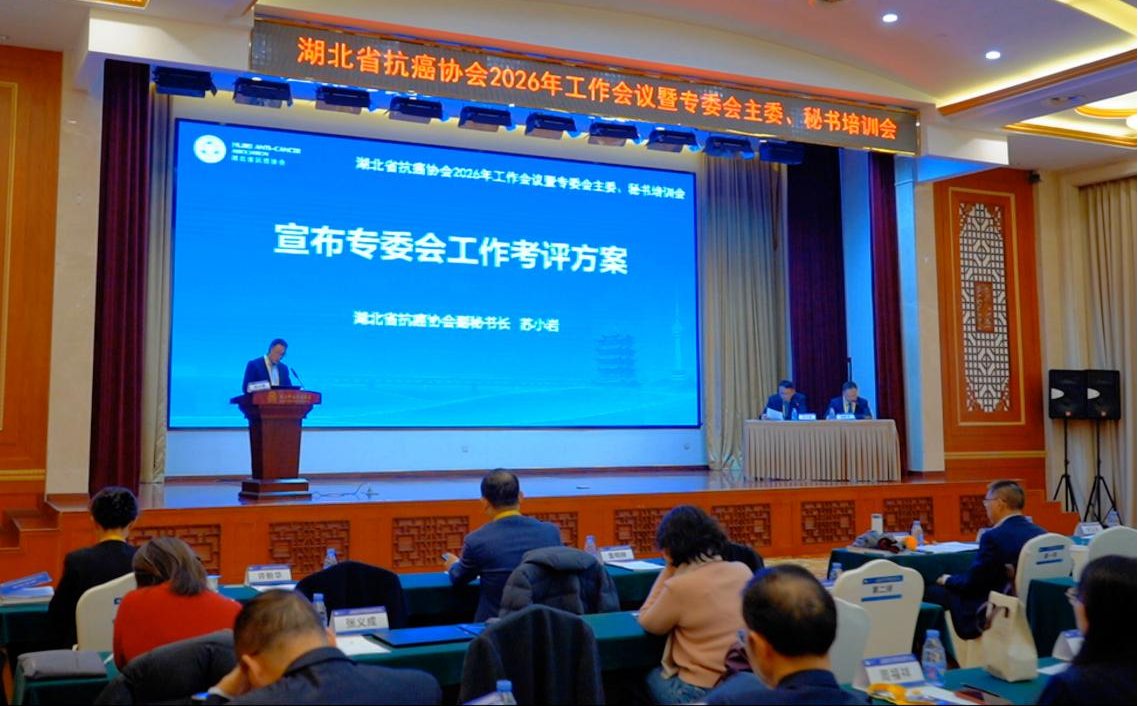 2026年2月6日,湖北省抗癌协会2026年工作会暨专委会主委、秘书培训会在武汉顺利召开。会议以规范专委会管理、明晰年度工作方向为核心,设置现场汇报、专业评审、工作部署等环节,协会领导、评委专家及各专委会主委、秘书参会。会议由协会组织部长吴东德、学术部长梁新军主持。湖北省医评办社团组织部主任、湖北省抗癌协会党建指导员陆泓主任出席会议。