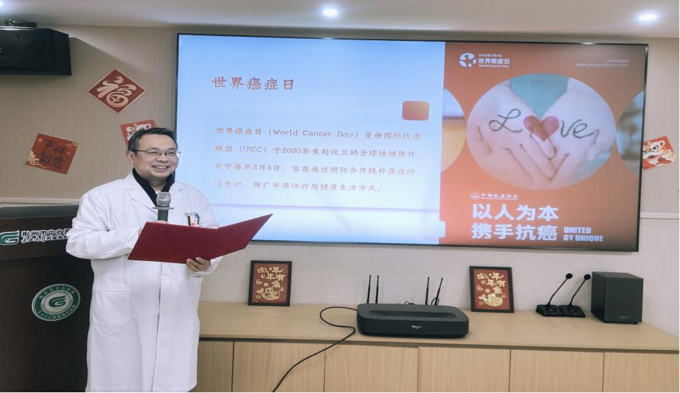 湖北省抗癌协会常务理事、荆州市中心医院肿瘤中心主任唐曦发表致辞,他指出世界癌症日寓意 “跨越四季,持续关怀”,抗癌是需长期投入的系统工程。他同时深度解读主题,“以人为本” 即以患者为中心,关注其身心整体健康与生活质量;“携手抗癌” 则需凝聚患者、家属、医护及社会各界合力。他勉励在场人员坚定信心、传递温暖,携手奔赴更有尊严的抗癌之路,为活动奠定坚实思想基础。