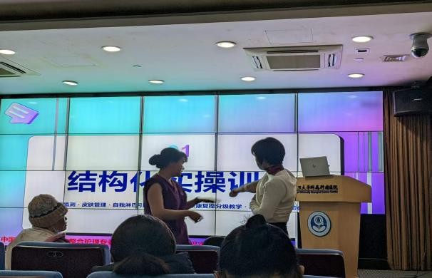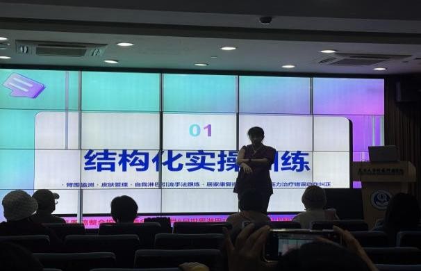 来自不同区域的淋巴水肿治疗师、护士长及护理骨干们带领患者开展结构化实操训练,其中包含臂围监测、皮肤管理、自我淋巴引流手法跟练、居家康复操分级教学、压力治疗错误动作纠正,以及答疑解惑环节。
