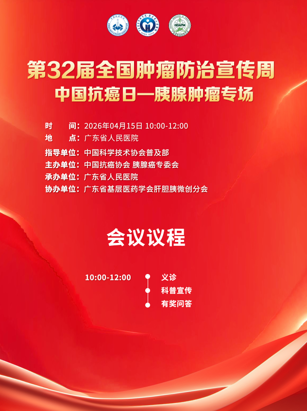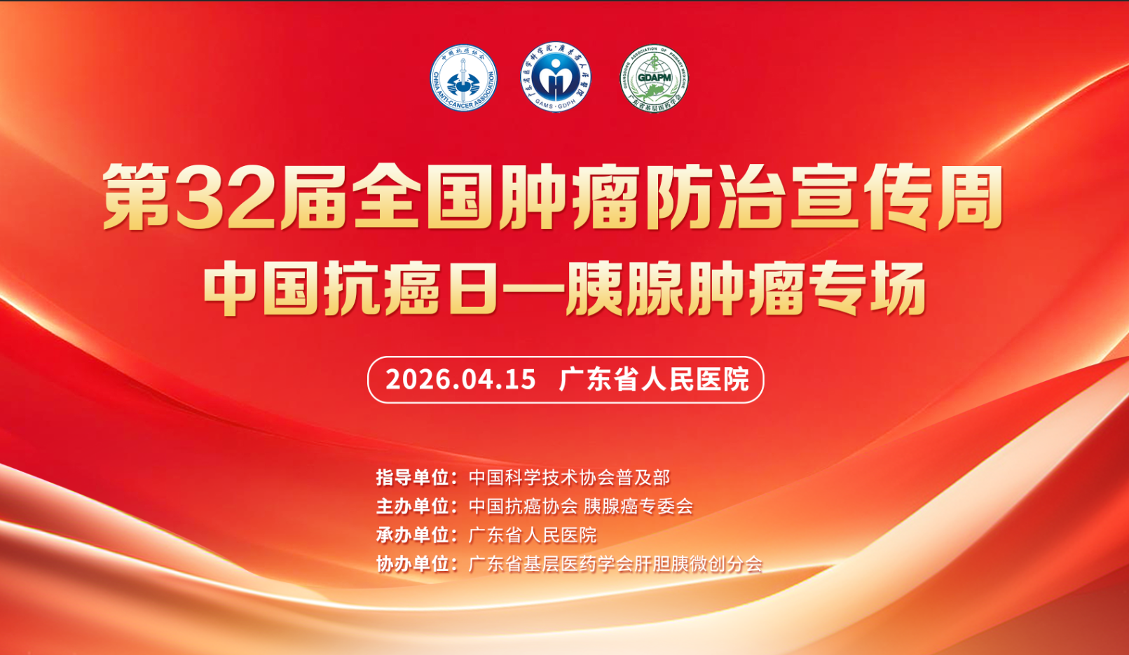 2026年是深入推进《健康中国行动——癌症防治行动实施方案(2023—2030年)》的关键之年,也是持续提升全民癌症防治核心知识知晓率的重要节点。值此第32届全国肿瘤防治宣传周暨中国抗癌日来临之际,为进一步普及肿瘤防治知识,推动优质医疗资源下沉,中国抗癌协会胰腺癌专委会联合广东省人民医院,将于2026年4月15日在广州举办“胰腺肿瘤专场”系列活动。