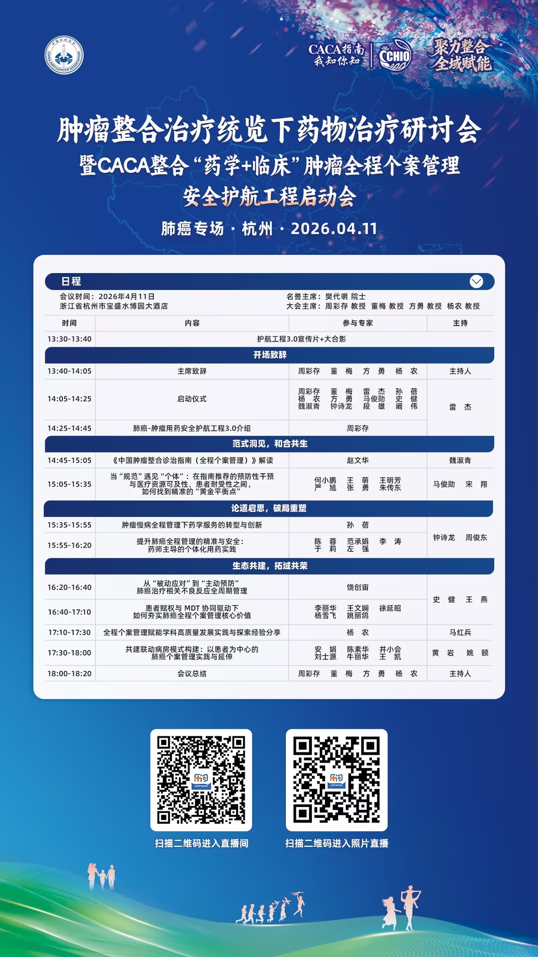 潮起钱塘,共话肺腑护航;智聚杭城,同绘抗癌蓝图。2026年4月11日,“CACA整合‘药学+临床’肿瘤全程个案管理-安全护航工程3.0(肺癌专场)”将在浙江杭州正式启航。本次会议以“肿瘤防治,赢在整合”为核心理念,以全程个案管理为实践主线,深耕药学、临床深度融合的创新路径,为肺癌诊疗的安全化、规范化发展注入全新动能。