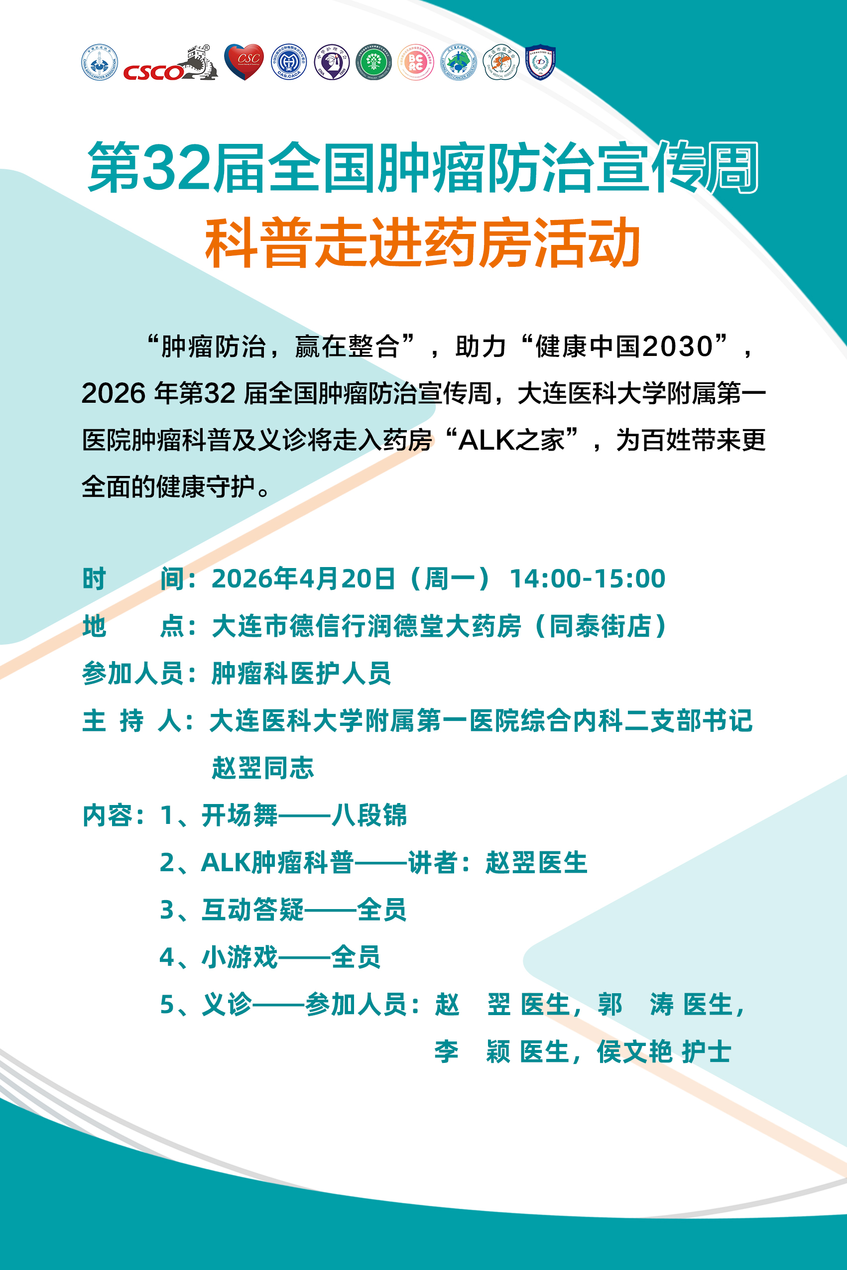 肿瘤防治,赢在整合”,助力“健康中国2030”,2026年第32届全国肿瘤防治宣传周,免疫治疗专委委员、大连医科大学附属第一医院肿瘤科赵翌主任带领团队,普及义诊将走入药房“ALK之家”,为百姓带来更全面的健康守护。