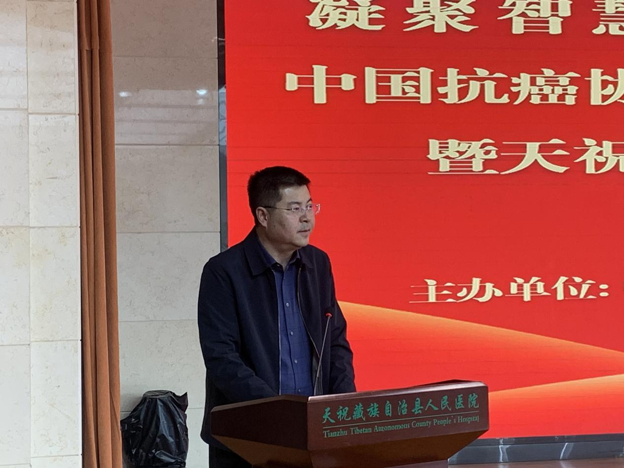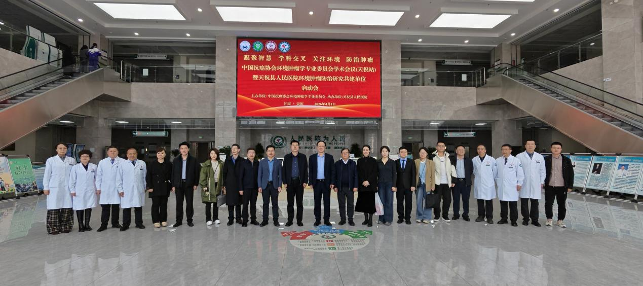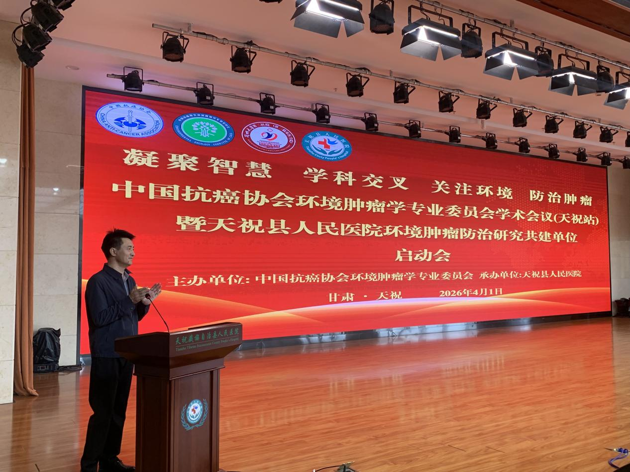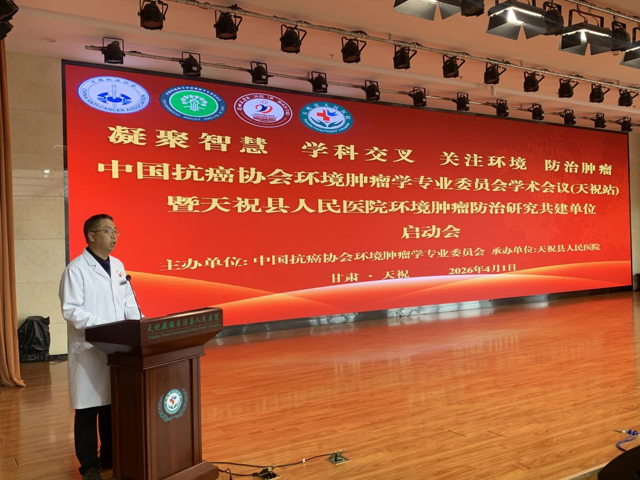 2026 年4月1 日,中国抗癌协会环境肿瘤学专业委员会学术会议(天祝站)暨天祝藏族自治县人民医院环境肿瘤防治共建单位启动会在天祝成功召开。中国抗癌协会环境肿瘤学专业委员会主任委员李玉民教授,兰州大学第一医院副院长赵达教授,兰州大学第二医院重症医学科副主任张军强教授、肿瘤外科主任医师党建中教授、杜志兴教授,天祝县人民政府副县长郑魁,天祝县卫健局党组书记、局长蔡开辉,天祝县人民医院党委书记朱青学、院长华民、副院长周斌等领导、环境肿瘤学专委会专家团队及县医院医务人员200余代表参会。