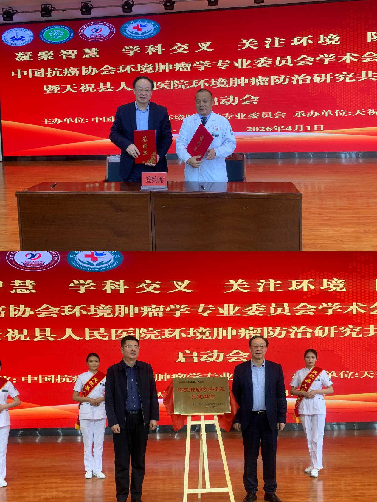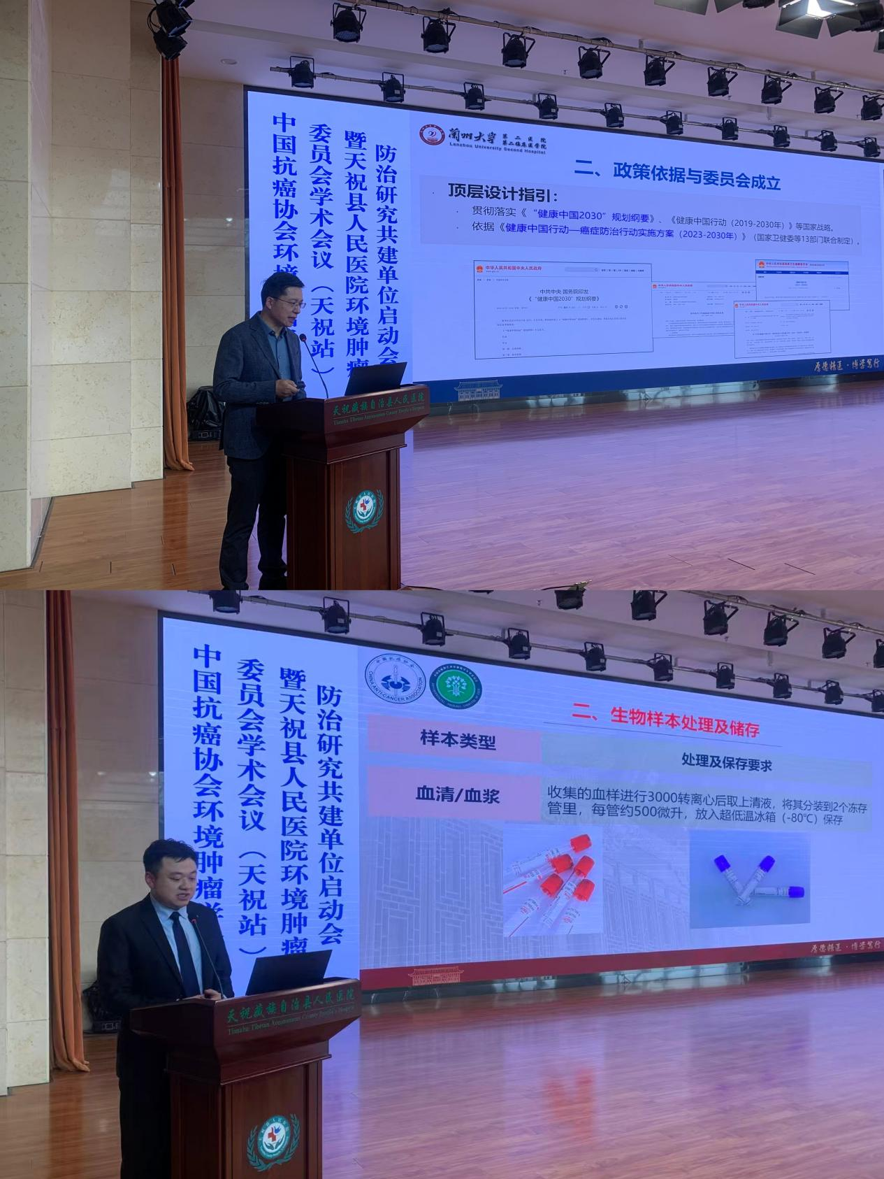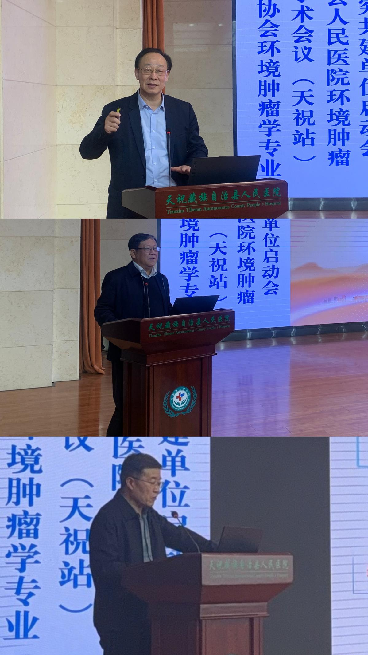 2026 年4月1 日,中国抗癌协会环境肿瘤学专业委员会学术会议(天祝站)暨天祝藏族自治县人民医院环境肿瘤防治共建单位启动会在天祝成功召开。中国抗癌协会环境肿瘤学专业委员会主任委员李玉民教授,兰州大学第一医院副院长赵达教授,兰州大学第二医院重症医学科副主任张军强教授、肿瘤外科主任医师党建中教授、杜志兴教授,天祝县人民政府副县长郑魁,天祝县卫健局党组书记、局长蔡开辉,天祝县人民医院党委书记朱青学、院长华民、副院长周斌等领导、环境肿瘤学专委会专家团队及县医院医务人员200余代表参会。