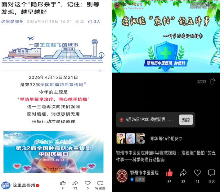 肿瘤科构建线上线下一体化科普矩阵,同步通过官方微信公众号、鄂州融媒体公众号推送防癌知识图文、短视频等内容,覆盖肿瘤防控、饮食营养、中医调养、三级预防等核心知识,扩大宣传覆盖面与影响力,让科学防癌理念深入人心。